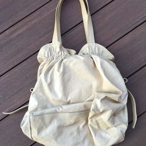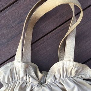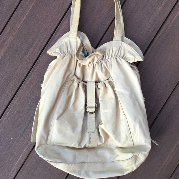 Beautiful stone/cream/beige leather. Handles show some discoloration from use. Very versatile color.