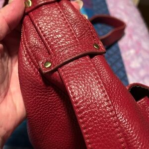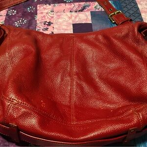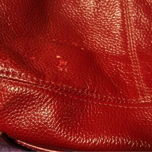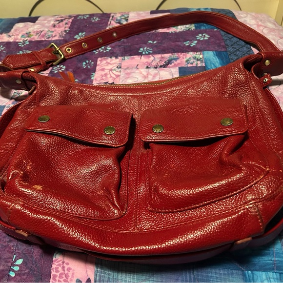 GUC. Not Rational red leather shoulder bag with convenient front pockets. 11x10”. Some wear and a broken tab around the strap. Interior is clean!