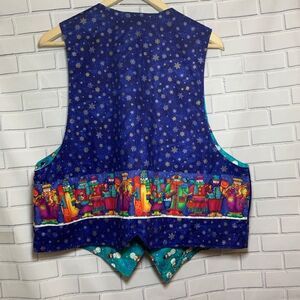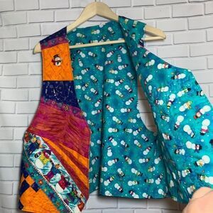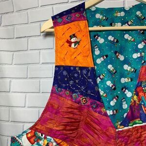 This is just so cute!! Done in a patchwork pattern on one side, snowmen on the other. There is a little snowman pin attached, and some interesting fabrics and designs throughout. Measures 24" at longest part of the bottom hemline, approximately 14" across in the chest area laying flat, and 20" at the lowest part of the arm openings.