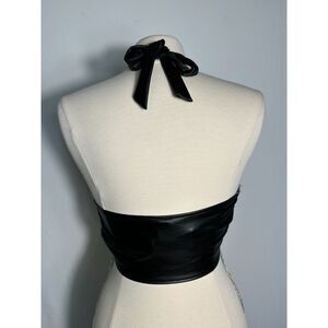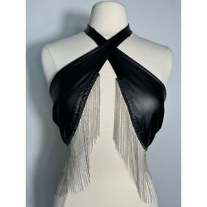Play hard to get in this edgy faux leather crop top featuring a sleeveless halter neckline, wrap-style straps, ball-chain fringe, and a partial open-back. The smooth faux leather fabric offers minimal stretch. Complete the look in sleek high-rise pants and heels.