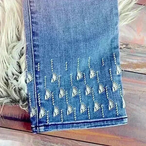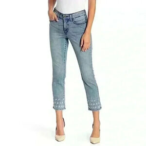 Like new no visible flaws NYDJ Sheri slim embroidered ankle jeans Ankle length. Sllim straight leg. Palm dot embroidery. 5- pocket styling. Zip fly with button closure. 91% cotton, 7% polyester, 2% elastane, with quite a bit of stretch.
