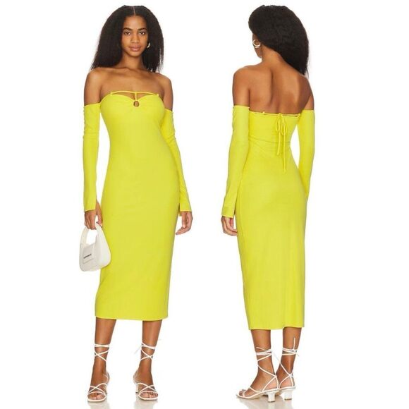 The Not Yours To Keep Sunny Ribbed Midi Dress in yellow citron features an off-the-shoulder design with a figure-hugging ribbed