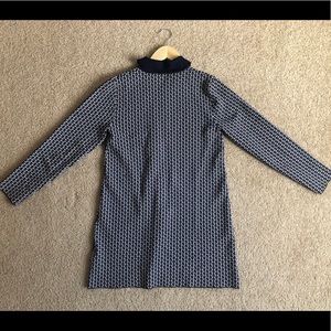 - polo collar, long sleeves, A-line silhouette, front button closure