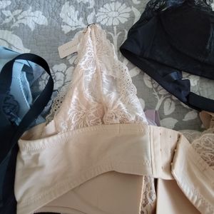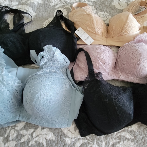Bought on line from Understance. Price is for 6 bras. 2 blue 2 black, 1 beige 1 liliac. all have tags accept liliac. side support bones, ovelap fabric detail, not underwired, they have built in lift and support. lots of details. different styles. 3 hook closures.