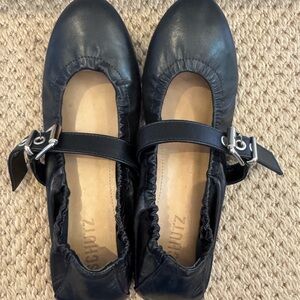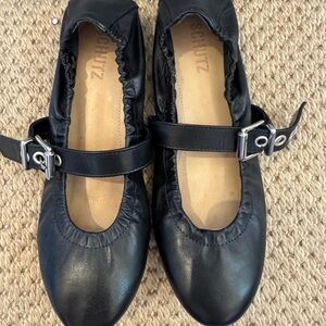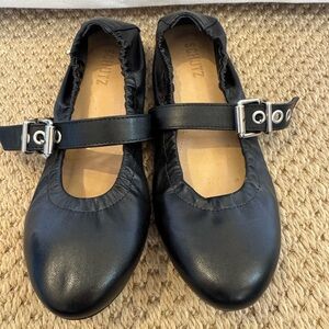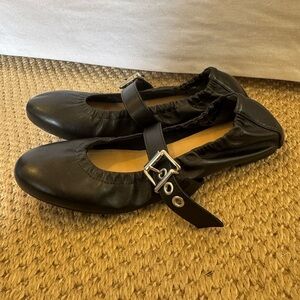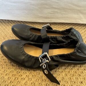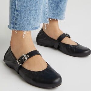 Chic black leather flats with a stylish buckle strap. Ideal for everyday wear. A bold buckle strap adds a splash of moto edge to this sleek round-toe flat.
