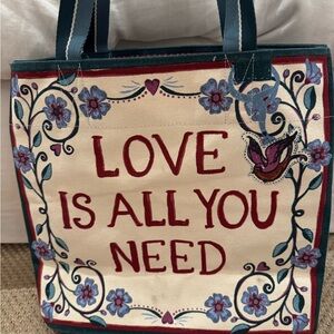 Featuring a vibrant multicolor exterior complemented by a playful "Love Is All You Need" theme, this large tote is perfect for women who appreciate a touch of whimsy in their accessories. The double handles ensure comfort and convenience, making it ideal for casual outings, travel, or workwear.Within its spacious interior, you'll find a canvas lining adorned with pockets to keep your essentials organized. The tote's rectangle shape and 9-inch strap drop offer a structured yet relaxed look that transitions effortlessly from day to night.