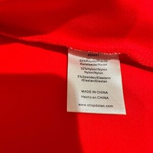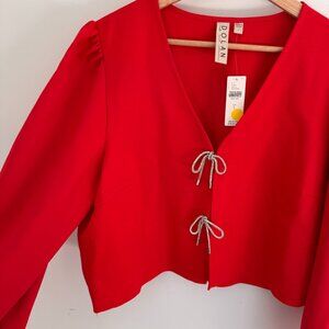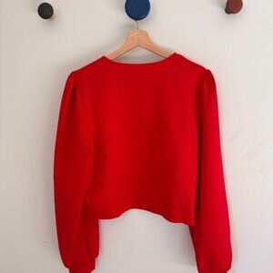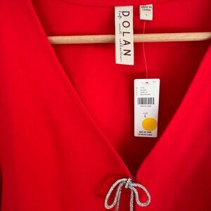 Vibrant red blouse by Dolan. Features tie accents on the front. Long sleeves and V-neckline.