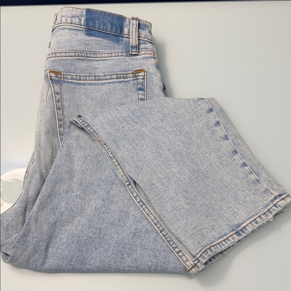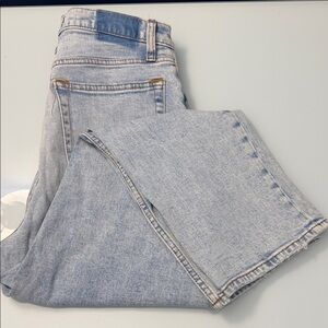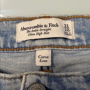 These jeans are lightly used, with normal wear and tear, overall still in great condition! These are a pair of light wash size 31/12R jeans by Abercrombie & Fitch in The Ankle Straight Ultra High Rise in the Curve Love fit! They have mild intentional distressing through throughout. Measurements are as pictured. Comes from a non-smoking household.