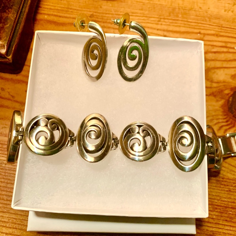 NOT FOR SALE Beautiful Vintage Brighton Contempo bracelet and earrings set. This beautiful silver set is in really good condition. The oval swirl link bracelet is 1 inch in width and the length is 7.25-7.75 ext