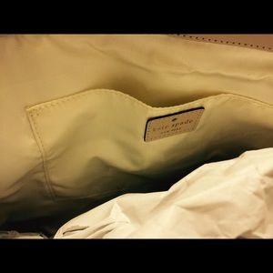 Very pretty creamy tan colored bag open at top with a wristlet in the same print included. Never been unwrapped. Took one look at the pretty light colored bag and put it straight away into a closet. I have a three year old. Enough said. Comes with dust bag and original manufacturers wrapping/tags. Two bags for the price of one. My dog is the same lovely color as the bag and he felt it was way too similar for his liking and our house doesn't smoke. No trades, reasonable offers through make offer!