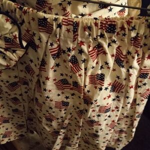 not new,vintage stylish wrap around halter& matching roomy elastic waist skort with a patriotic flag print & matching twisted ponyholder size small/medium. Features red, white, and blue colors. short length is 18 inches& 100% cotton.