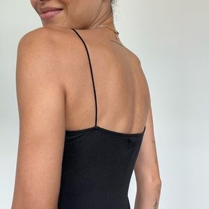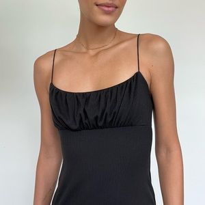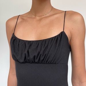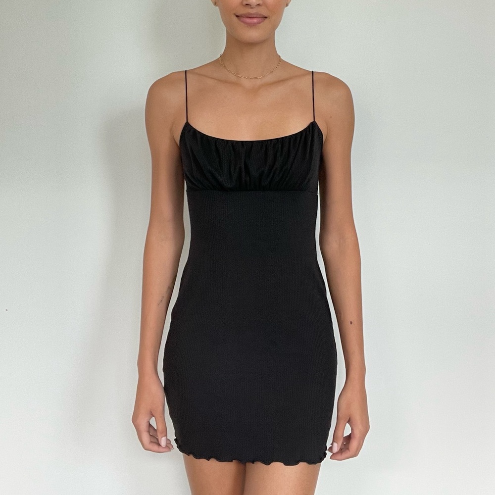 Urban Outfitters summer-ready mini dress cut from a soft ribbed fabrication with a scoop neckline, spaghetti straps to shoulder, gathered bust, slim fit and cute mini length lettuce hem. 80% polyester, 14% crayon, 6% spandex.