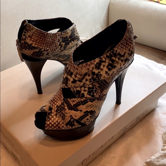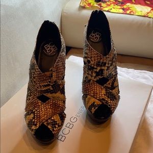 BCBG , snake print botties , open toe with small silver studs .. very similar to some red bottoms botties . Very comfortable plataform helps a lot . Zipper on the back. No scratches what so ever. Perfect conditions