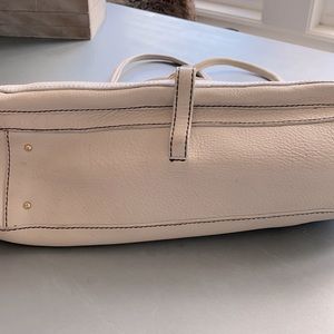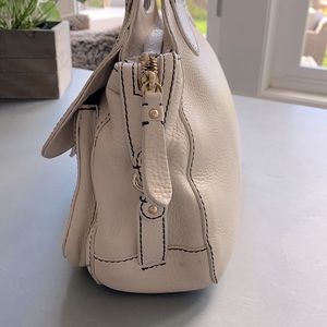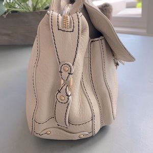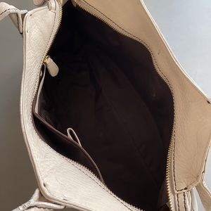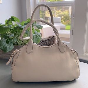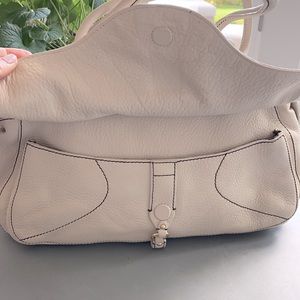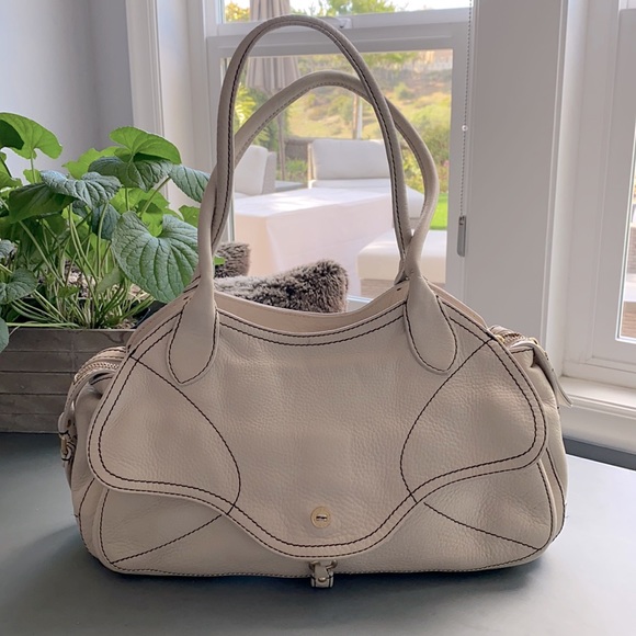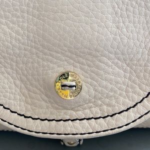 Beautiful cream colored pebble leather Cole Hassan purse. Fits perfectly over your shoulder and under your arm. Many pockets and holds a lot. Black contrast stitching. Gently used but in great condition.