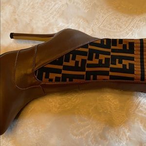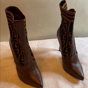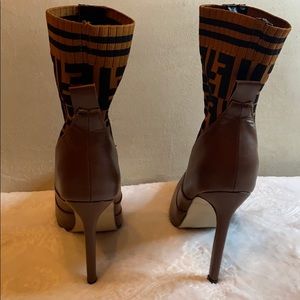 This are FEND INSPIRED sock booties. They are leather . Wore them once with the Jean dress , very comfortable. No box no shoe bag