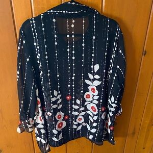 Elegant black blouse with white dot pattern. Ideal for versatile styling. Two piece outfit with long sleeve sheer top with tank top under shirt. Pet friendly home.