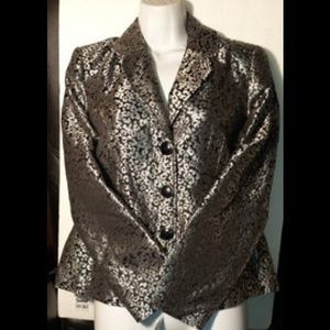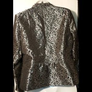Women's size Medium petite jacket / blazer / coat by Notations. This jacket has 3 buttons front closure, long sleeves, fully lined, no pockets, fabric is Silver and black print. Could be worn with slacks, a pair of black jeans, a black skirt or a black dress with heels or boots depending on length.
