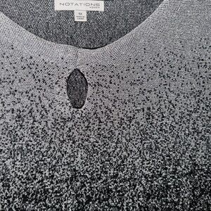 Gently pre-owned plus size knit top with ombre black and silver metallic glitter design. Very roomy through the bust, with wide batwing sleeves that are not short but not quite 3/4 length. Banded waistband allows for tunic style or blousing. Hard to capture the shine/sparkle in the photos.
