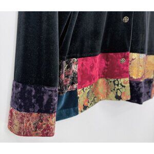 This is a stylish black velvet jacket by Notations, featuring patchwork brocade jacquard velvet accents for a bohemian and vintage look. The jacket has a button front closure, long sleeves, and a short length, making it suitable for various occasions such as travel, parties, casual outings, or formal events. The unique design and rich fabric make this jacket a statement piece in a size large, perfect for adding a touch of hippie or 90s-inspired style to your wardrobe. Good used condition. No stains or holes found. Please feel free to ask any questions.