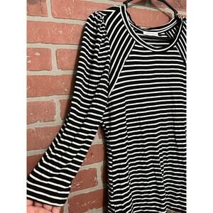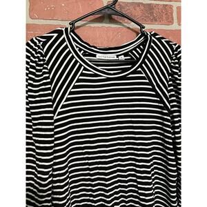 It features a black and white striped pattern and flattering 3/4 sleeves.