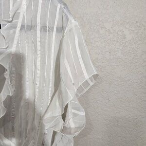 This sheer blouse features a striped pattern with ruffle detailing and a front tie. Its lightweight fabric provides an airy and elegant look for professional settings. This is a great whimsical fairy style shirt with ruffles and a maximalist layering potential.