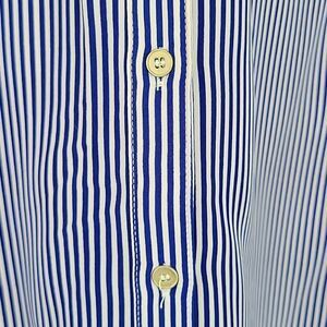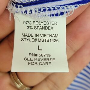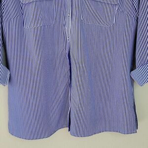 New with tags long sleeved, striped blouse made by Notations in size Lage. Nautical feel with blue and white vertical stripes. Roll tab sleeves can be worn long or rolled up and secured with the button tab. There are 2 functional chest pockets with button closures and side slits on the bottom hem. Perfect for everyday casual wear. But it could also be tucked into dress pants for a business casual look. There are 3 small stubborn folds/wrinkles on the back of the collar (pictures 7 and 9). Otherwise, in ENC with no holes, snags, or stains. Bundle with other items for the best deal!
