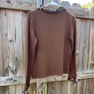 Stylish brown V-neck sweater by Notations. Features an eye-catching leopard cheetah print collar.