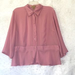 Front button up 3/4 length sleeve blouse dusty rose pink lightly flared Peplum style hemline. Semi Shear. 100% polyester. Front and back darts. Approximate flat lay measurements: Pit to pit 23” Length 24.5” Sleeve 18” from shoulder seam. Top would look great with a cream, black, brown or navy camisole and matching colored skirt. Dressy office date night attire women's business professional apparel soft ruffle feminine flouncy stylish fashionable