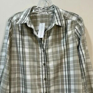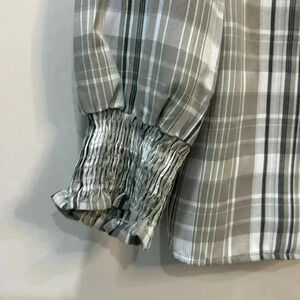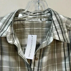 Elevate your wardrobe with this brand new Notations button-down blouse in a chic gray, white, and black color combination. Made from 100% rayon, this blouse is not only stylish but also easy to care for with machine wash capabilities. The collared neckline adds a touch of sophistication, while the long sleeves with gathered cuffs provide a trendy silhouette. This versatile blouse is perfect for both casual and professional settings, making it a must-have addition to your closet. Pair it with jeans for a laid-back look or dress it up with tailored pants for a polished ensemble. Update your wardrobe with this stylish and comfortable Notations blouse in size M today!