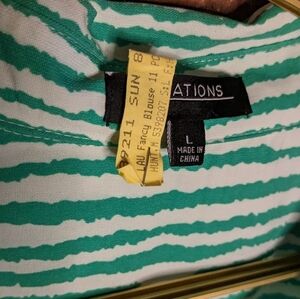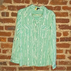 Notations Large Green & White Vertical Striped Long Sleeve Button Down Shirt