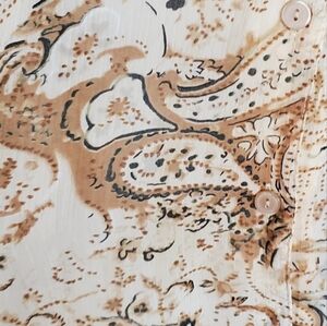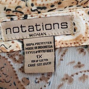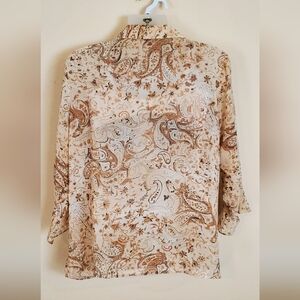 Notations light button up blouse in size 1x. With sheer fabric and a mixed paisley patterns in soft, warm tones.
