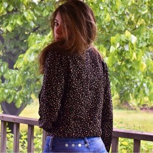 This blouse is so pretty with it’s subtle cheetah pattern & pearl-like buttons, I love it! This shirt is in perfect condition & is ready for a new home! It’s so comfortable & looks so classy. Would look nice tied up, tucked in, or letting it flow with a tank top🖤