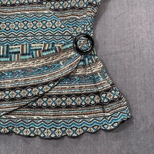 This petite wrap-style top features a geometric pattern in turquoise and brown, complemented by a buckle accent. Crafted for both comfort and style, it is suitable for various professional or casual settings. The short sleeves and flattering design ensure ease of movement while maintaining a polished look.