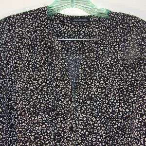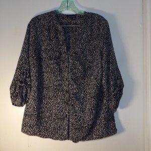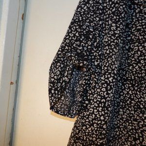 black with small scale white patterned print , longer sleeves have roll tabs , button down center front , covered double breast pockets , material is 97% Polyester 3% Spandex , Sz M measurements are roughly 25" from shoulder to hem and about 21" pit to pit , good pre owned or used condition No Issues , Pet friendly non smoking home