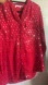 Elegant red blouse with black accents. Features button-up front and chest pockets. Ideal for versatile styling.