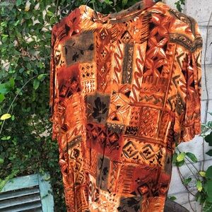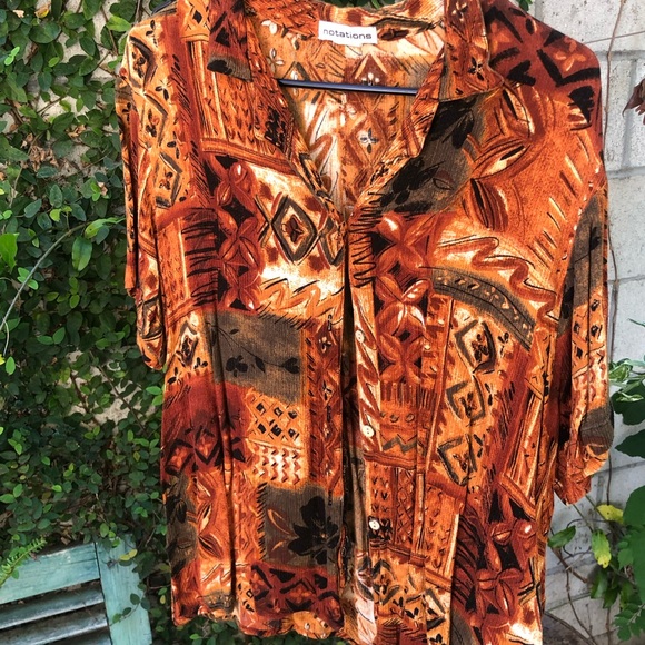 Patterned button-up top by Notations. Rich rust and brown tones with subtle black accents.