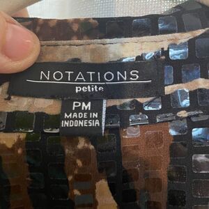 This is an eye-catching Notations sequin jacket in a bold animal print, size petite medium. It features an abstract zebra print in rich earth tones with all-over square clear sequins, giving this jacket a great shimmer. Jean jacket styling with a button front, two breast pockets, and a flattering shorter silhouette make this fun blazer a stand-out! Lightweight so you can wear it now over a summer top, or in the fall over a heavier sweater. Non-smoking home, excellent used condition.