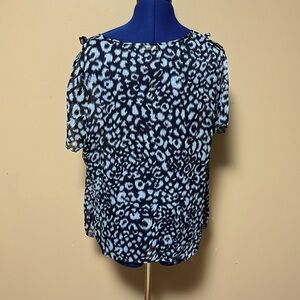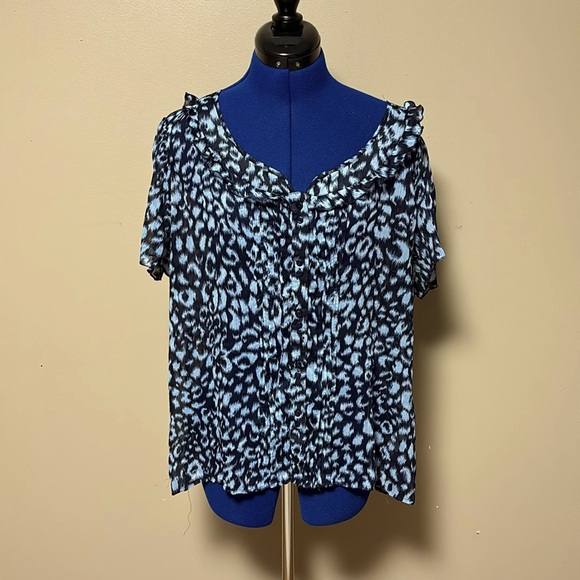 Notations top with small ruffles around front yoke, button front, light and navy blue, very comfortable and lightweight, cute with jeans or dress up with skirt, leggings or slacks