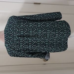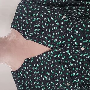 Notations, Size L Black with Green Polka Dot Button Down Roll Tab Sleeve Shirt. Excellent Condition, No Holes, Rips, Stains or Snags. Cute Black Button Down with Differing Shades of Green Polka Dots along with Mini White Polka Dots. Lightweight and very comfy. Please refer to measurements in photos to ensure proper fit.
