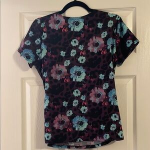 Chic black wrap blouse with blue and purple floral pattern. Features a stylish buckle accent. Ideal for versatile wear.