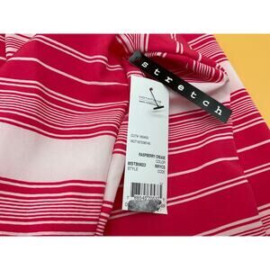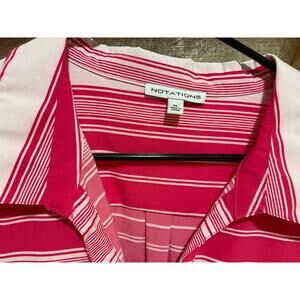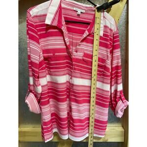This Notations top in size XL features a chic black and white striped pattern, offering versatility with adjustable 3/4 roll sleeves that can also be worn long. It includes a button closure and a collared design that enhances its sophisticated look. The top is made from a stretchy spandex-polyester blend, ensuring comfort and a flattering fit. Side slits add an extra touch of style. This machine-washable top is in great condition and perfect for both casual and business settings.