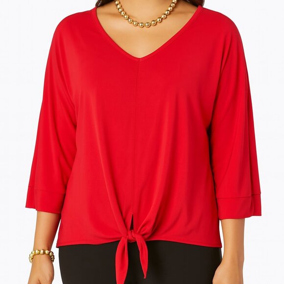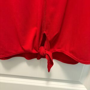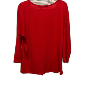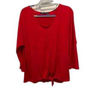Notations Top with 3/4 Sleeves. Knotted tie at bottom. Rounded Neckline. Size Medium. Red. Approx. measurements: pit to pit 23", shoulder to bottom hem 24". Polyester 96%. Spandex 4%. Excellent preowned condition. No flaws, rips, stains.