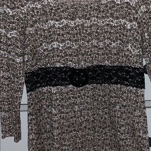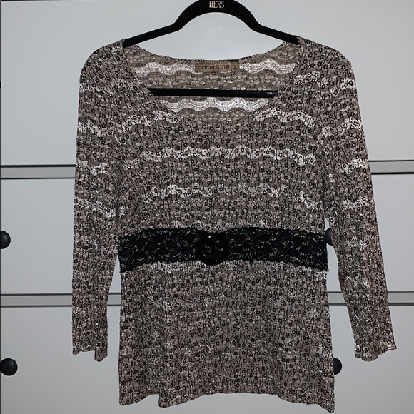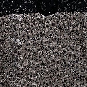 A6 3/4 sleeves Small flower print Shiny Black Lace faux belt at waist