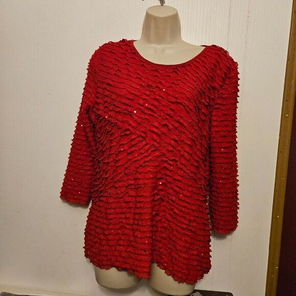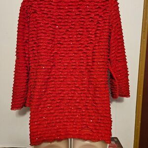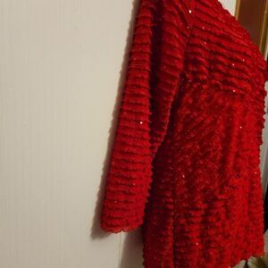 red long sleeve blouse with ruffles and sequins round neck arm pit to pit 20 length 25 97 % Polyester 3 % Spandex