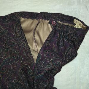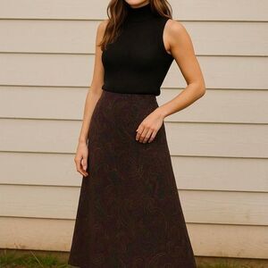 Stunning vintage-inspired paisley midi skirt in rich jewel tones — deep plum, forest green, and gold detailing. Gorgeous Western-meets-boho vibes with a modern, polished silhouette. Soft woven fabric with beautiful drape, perfect for styling with boots, knits, or a tucked blouse.