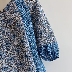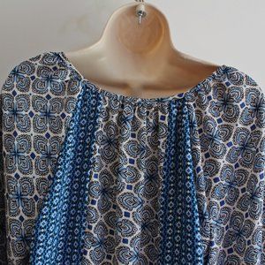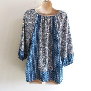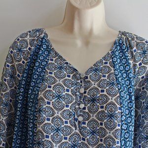 This boho blouse is lightweight and silky feeling. It is blue, black and off white with a geo floral print. It has a 3/4 length sleeves that are slightly bloused with elastic hems. It has a scoop v-neck front with four silver-tone metal buttons. It is new with tags.