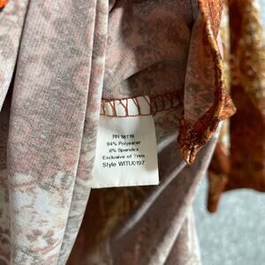 Women's plus size boho top by Notations Woman. This earth toned peasant top has a pattern in brown and tan with embroidered flowers on the yoke piece and 3/4 sleeves. It is a polyester spandex blend.