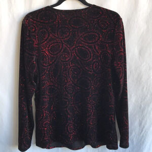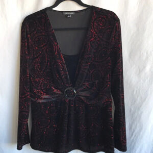 Notations black velvety holiday top with red glitter detailing, size L. Photos don’t quite capture the pretty overall effect. Long sleeves with decorative buckle detailing. Attached front-only velvet shell underneath. Great for holiday parties or festive dinners!