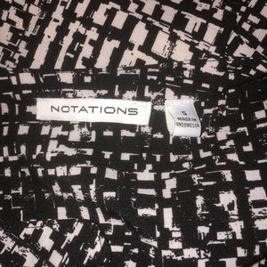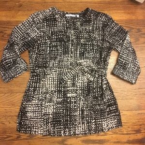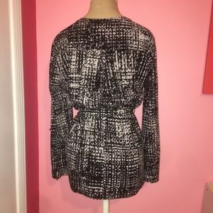 Black & white ink blot cross hatch design with buttons & natural waist tie belt.