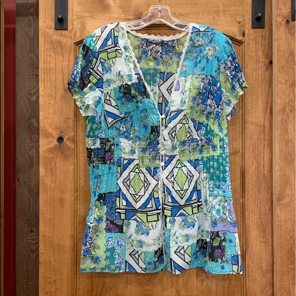 Gorgeous light material with lace trim. 5 front buttons Size 1x
